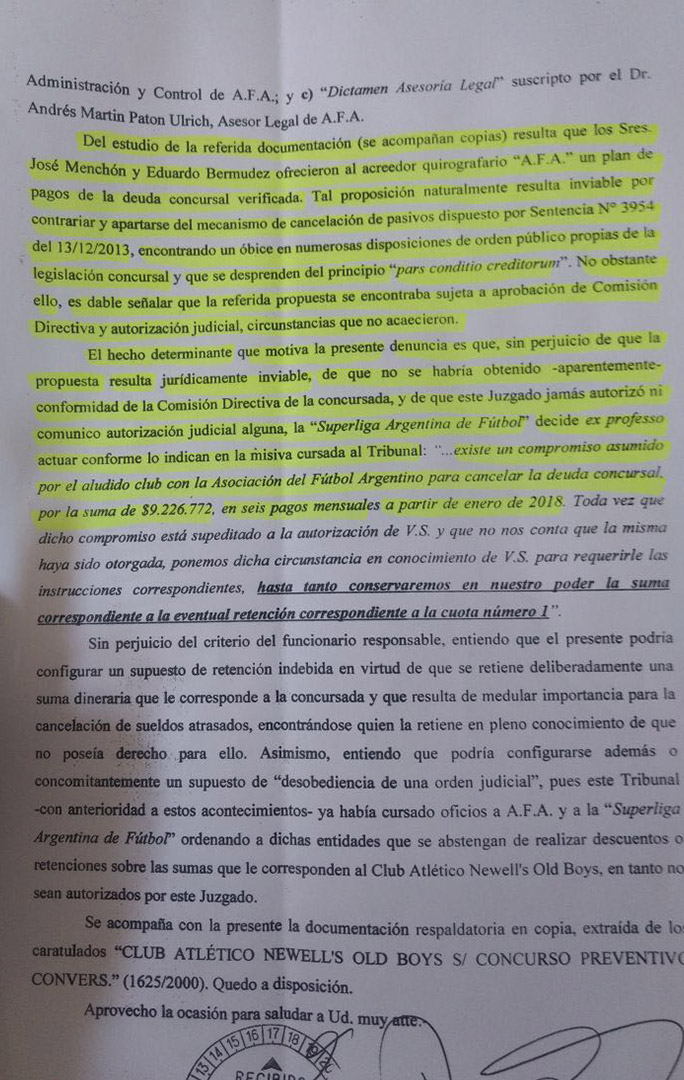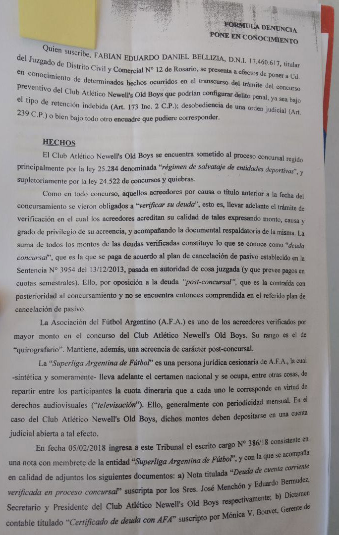 El juez del 12° Distrito Civil y Comercial Fabián Bellizia, quien entiende en el concurso preventivo de acreedores que transita Newell´s en el marco de la ley de salvataje financiero de entidades deportivas, presentó la denuncia por «administración fraudulenta e incumplimiento judicial que podrían constituir la comisión de delitos penales».