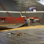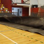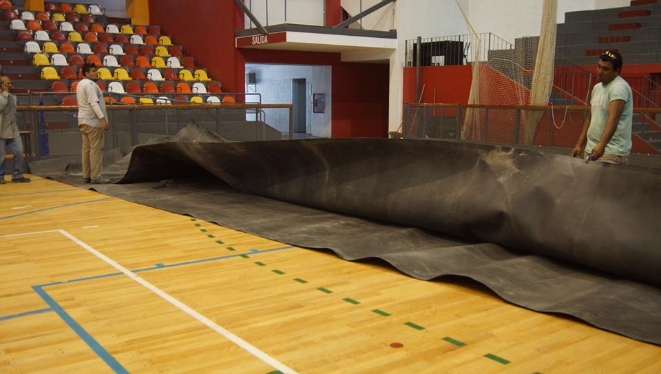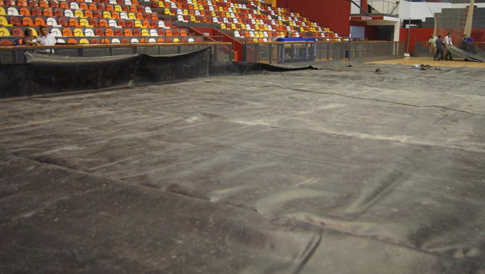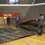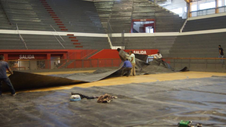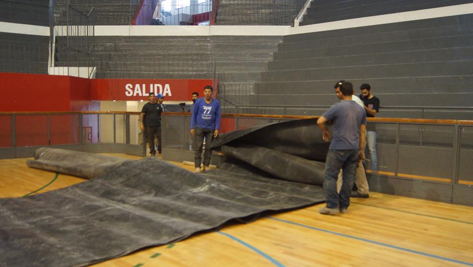 En horas de la mañana los obreros comenzaron con la colocación de la Geomembrana que cubrirá el parquet del estadio. Es una membrana que cuenta con un espesor de 1500 micrones, la cual evita que la humedad afecte el piso.
