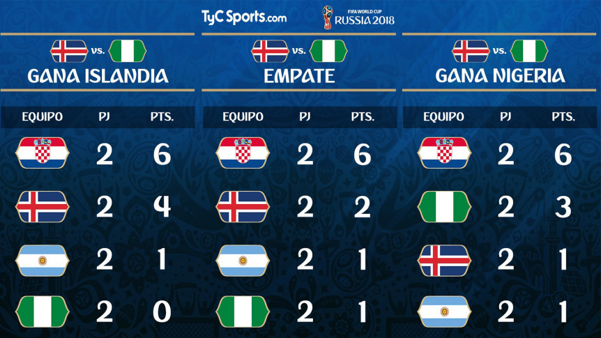 Finalmente, un empate mañana coloca a Islandia con dos puntos y a Argentina y Nigeria igualados en uno. Así, la Selección no dependería de sí misma ya que, por más que obtenga una victoria el próximo martes, necesitaría una victoria de un equipo croata que ya llega clasificado a octavos.