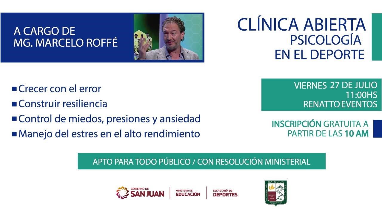 El viernes 27 de julio se retomarán las clases de la Diplomatura en Gestión Deportiva, después del receso y con ello se dará el cierre del tercer módulo de la diplomatura con la exposición del reconocido psicólogo deportivo Marcelo Roffe. Ante la cantidad de consultas y pedido de sanjuaninos que no participan de la Diplomatura se gestionó una disertación abierta al público a cargo del licenciado. La misma se realizará el viernes a partir de las 11:00 en Renatto y será con resolución ministerial.