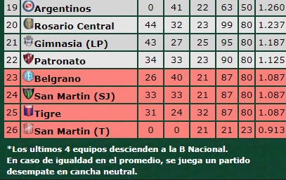 Por el descenso, descendió San Martín de Tucumán y hay cuatro equipos para tres descensos más. Patronato (90 puntos) quedó bien parado después de ganarle a Defensa y sacando cuatro puntos de seis quedará arriba de todos, arriba de Belgrano, San Martín de San Juan y Tigre, todos con 87.