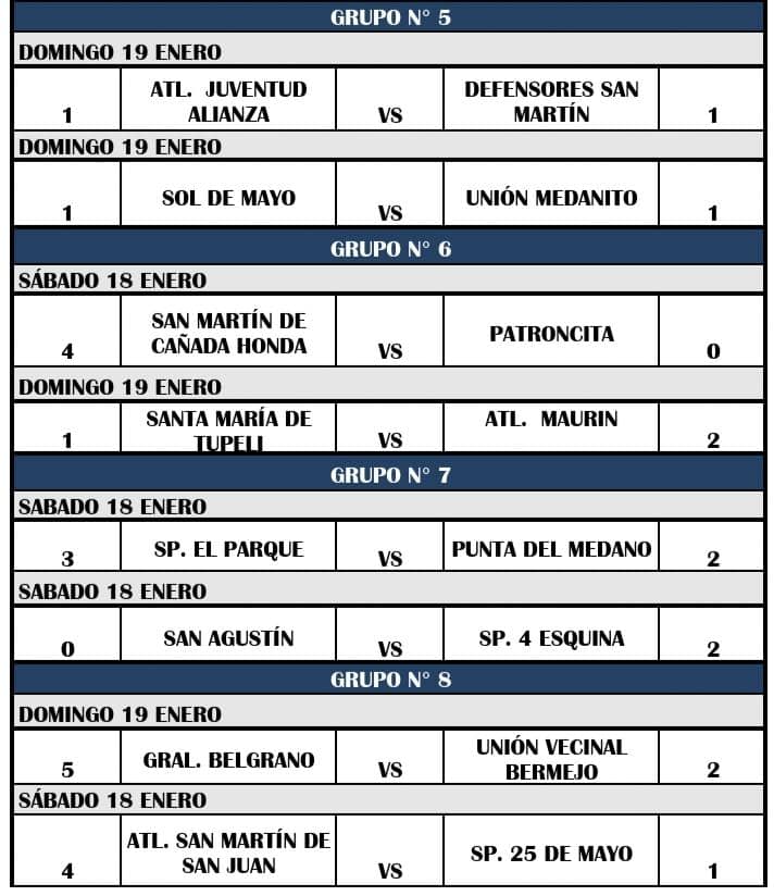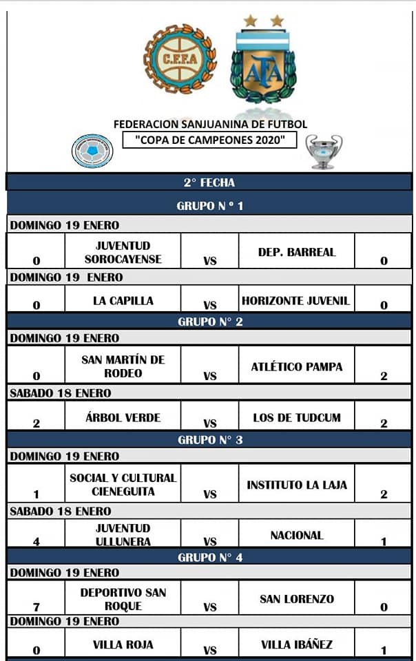 La Copa de Campeones 2020, que organiza la Federación Sanjuanina de Fútbol, durante el fin de semana tuvo la segunda fecha y dejó los siguientes resultados: