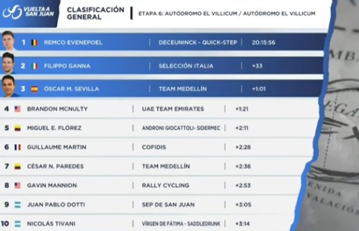 Respecto a la general, las cosas no cambiaron. Evenepoel sigue como líder, seguido por Filippo Ganna y Oscar Sevilla. Mañana se define todo en la Avenida de Circunvalación con 9 giros.