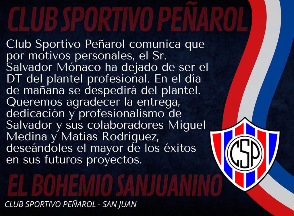 En las últimas horas, el club de Chimbas recibió una noticia inesperada: la renuncia sorpresiva de Salvador Mónaco, quien se despedirá del plantel en la práctica de este martes.