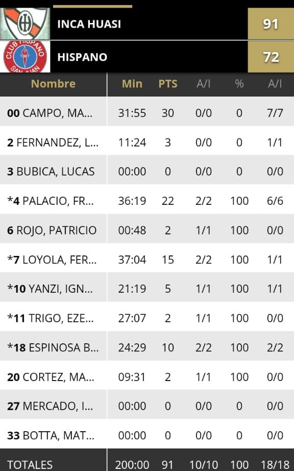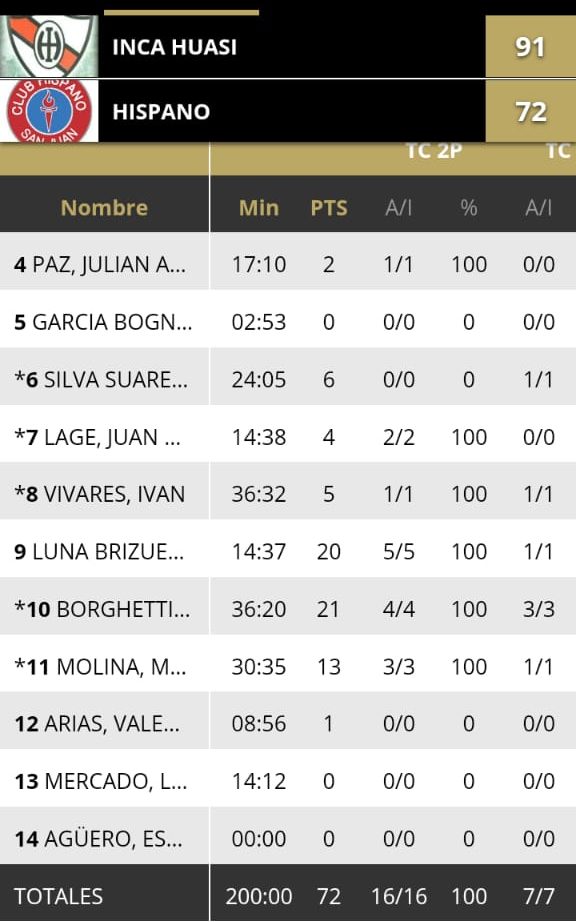 ESTADISTICAS INCA HUASI 91 – BANCO HISPANO 72