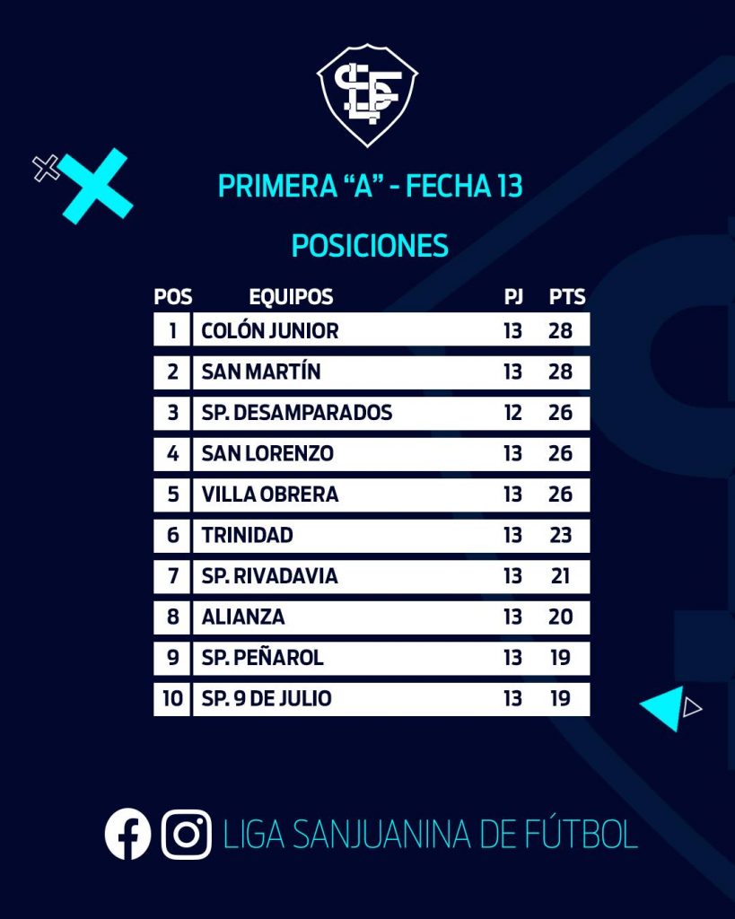 Este martes finalizó la fecha 13 del Torneo de Invierno de Liga Sanjuanina de Fútbol.