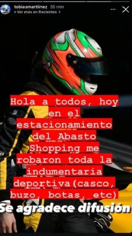 Martínez se encuentra en Buenos Aires para competir en el autódromo “Oscar y Juan Gálvez” de Buenos Aires, según informó en su cuenta de Instagram, delincuentes le robaron su equipamiento deportivo del estacionamiento. Entre los objetos sustraídos se encuentran su casco, buzo y botas de competición.