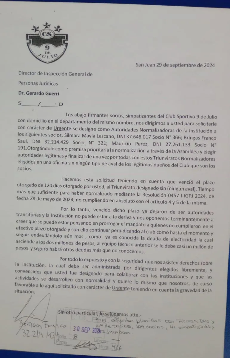 Los socios del Club 9 de Julio solicitaron a Personería Jurídica la designación de nuevas autoridades normalizadoras. En la nota presentada el 29 de septiembre al Director de Inspección General de Personas Jurídicas, Dr. Gerardo Guerri, subrayan la urgencia de que la institución sea gestionada por dirigentes legítimamente electos a través de una asamblea.