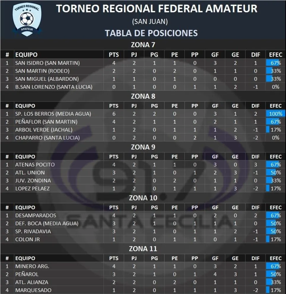 Los equipos restantes tuvieron triunfos, que les permite acomodarse en las tablas de posiciones de cada una de las zonas. El conjunto de Peñaflor le ganó 1-0 a Defensores Chaparrro, por su parte, el equipo de Mineros venció por 3-2 a Peñarol. Mientras que Rivadavia derrotó por 1-0 a Defensores de Boca. Además, Sportivo Los Berros obtuvo un triunfo por 1-0 sobre Árbol Verde de Jáchal y Unión le ganó 2-0 a López Peláez.