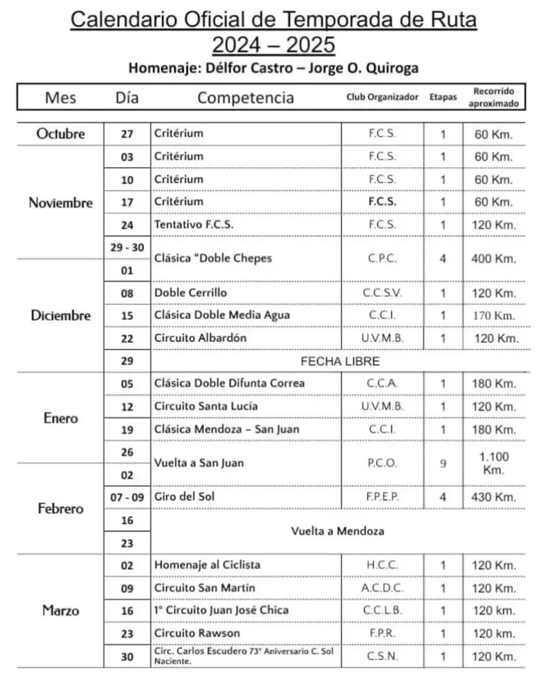 La Temporada de Ruta 2024/2025 comenzará el próximo domingo 27 de octubre con un critérium de 60 kilómetros en el autódromo El Zonda. Este año, se rendirá homenaje a los recientemente fallecidos dirigentes Delfor Castro y Jorge Quiroga.