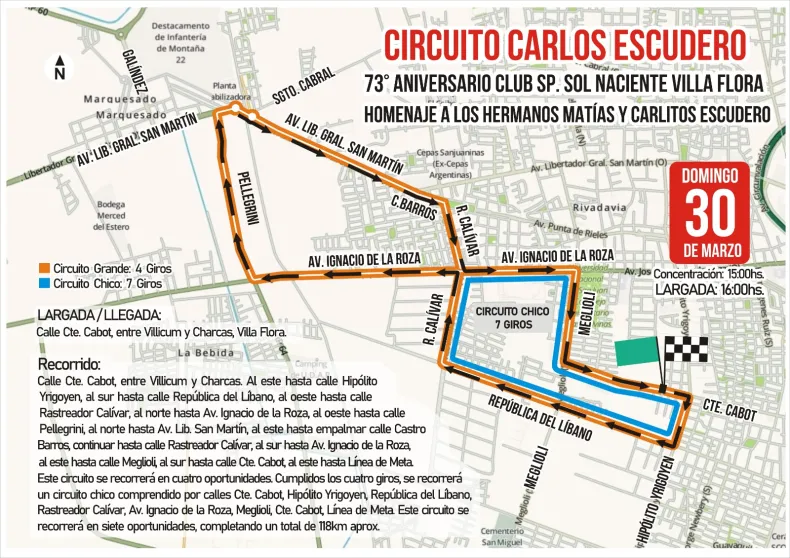 El desarrollo de la competencia incluirá cuatro giros a este circuito principal. Una vez completados, se sumarán siete vueltas a un circuito más reducido, que abarcará las calles Cabot, San Miguel, República del Líbano, Rastreador Calivar, Ignacio de la Roza, Meglioli y nuevamente Cabot.